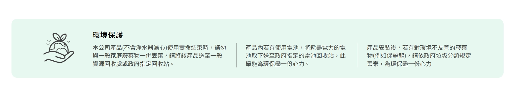 三、產品安裝後,若有對環境不友善的廢棄物(例如保麗龍),請依政府垃圾分類規定丟棄,為環保盡一份心力。